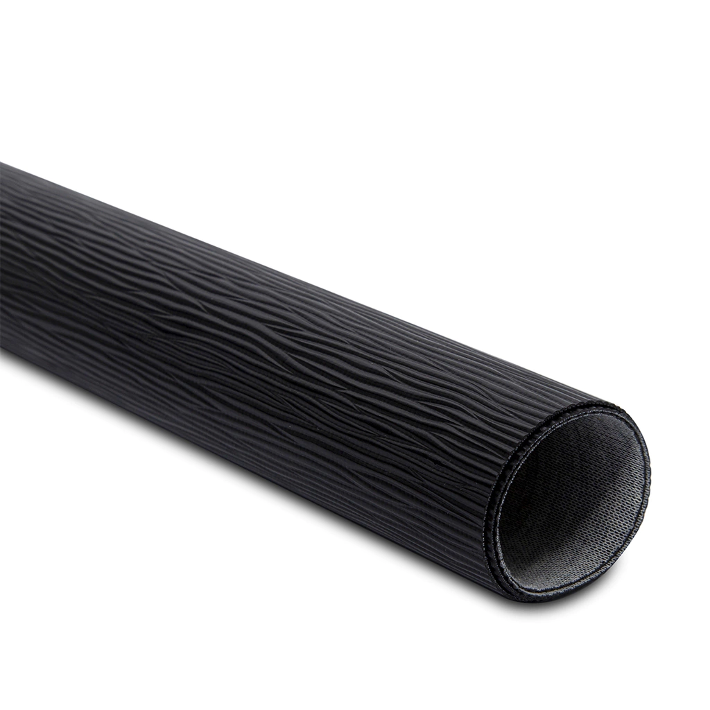 Possui gravação com riscos ondulados e por baixo possui uma trama de poliéster.