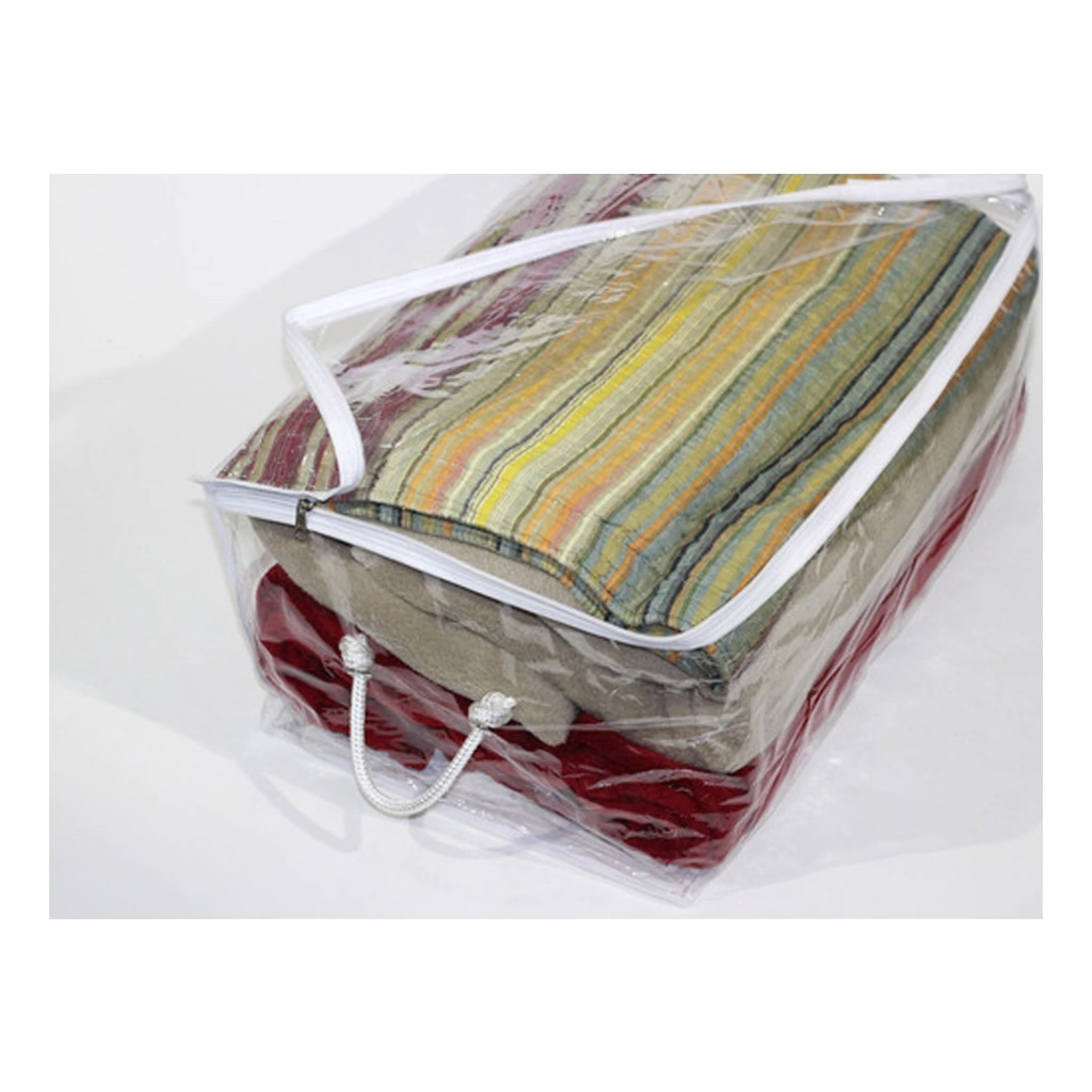 Organizador transparente em PVC flexível com zíper reforçado, alças de corda e costura industrial.